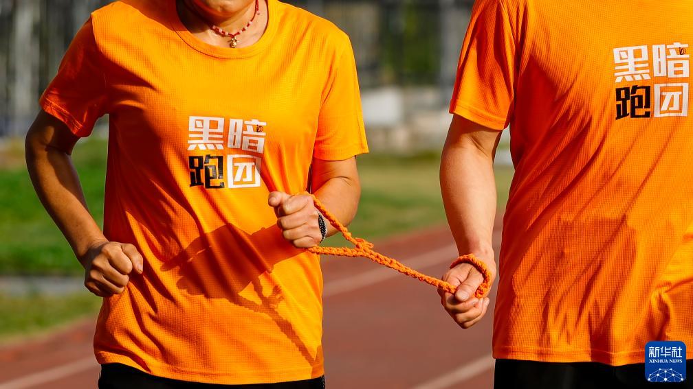 在四川大學華西校區運動場,“黑暗跑團”志願者許福嬋(左)用陪跑繩帶着視障跑者吳小華訓練(10月28日攝)。新華社記者 沈伯韓 攝