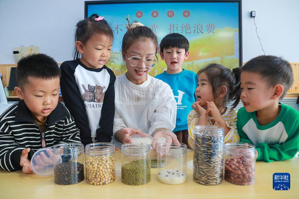 10月31日,在山東省高密市鳳鳴實驗幼兒園,孩子們在老師指導下認識糧食。