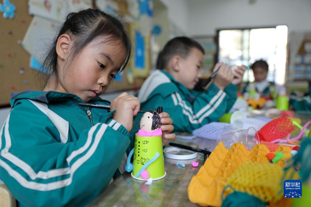 10月31日,貴州省開陽縣第二幼兒園的孩子用廢棄雞蛋殼和紙杯製作手工藝品。