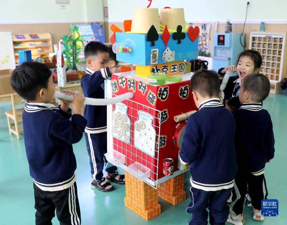 10月31日,在山東省滕州市龍泉街道中心幼兒園,小朋友們在“調試”用廢舊物品製成的“多功能機器人”。