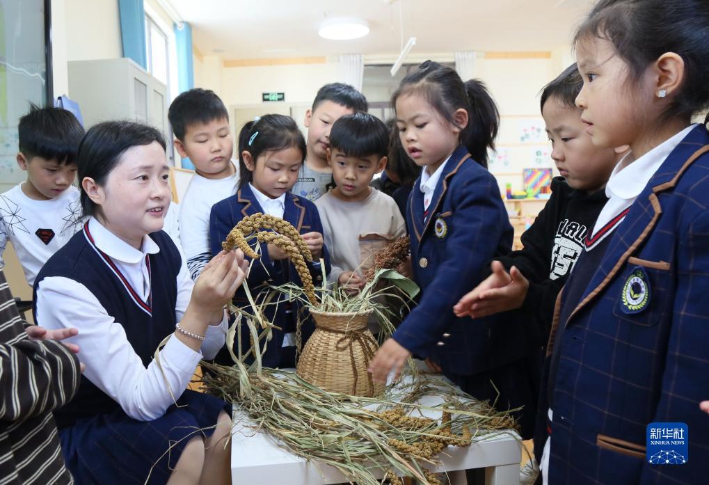 10月31日,河南省洛陽市汝陽縣新華園幼兒園老師教小朋友們識別穀子,提醒大家珍惜糧食。
