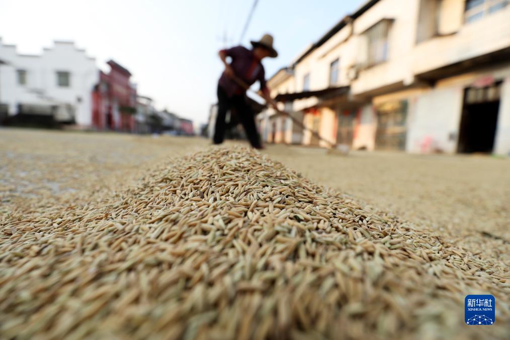 10月30日,在湖南省資興市唐洞街道高碼村,農民晾曬稻穀。