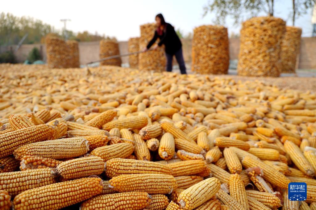 10月29日,在山東省濱州市一家糧食收購企業,工作人員晾曬收儲的玉米。