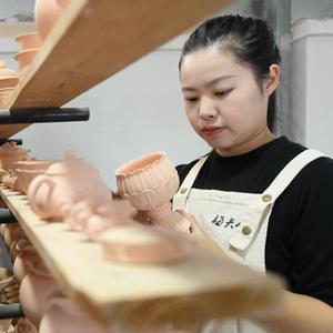 “95後”陶瓷夫妻檔季雙俊和季資美是高中和大學時的同學,因為共同的興趣走到一起。從景德鎮陶瓷工藝美院畢業後回到故鄉龍泉,夫妻二人在甌江旁的爐田村駐紮下來,成立了“梅夫人”工作室,潛心鑽研北宋風格的青瓷器。兩人從古瓷中尋找靈感,力圖重現北宋龍泉窯的胎釉特點,並借鑒青銅器、金銀器、古代服裝上的紋樣,在瓷上傾注對傳統文化的熱愛。