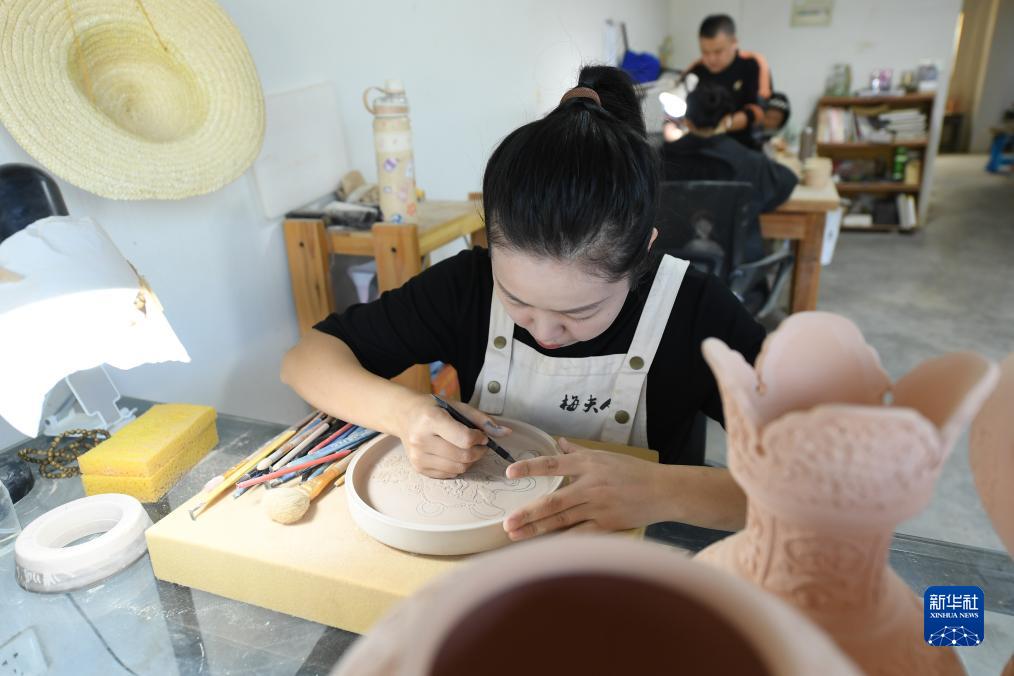 10月31日,在“梅夫人”工作室,季資美在瓷坯上刻繪。