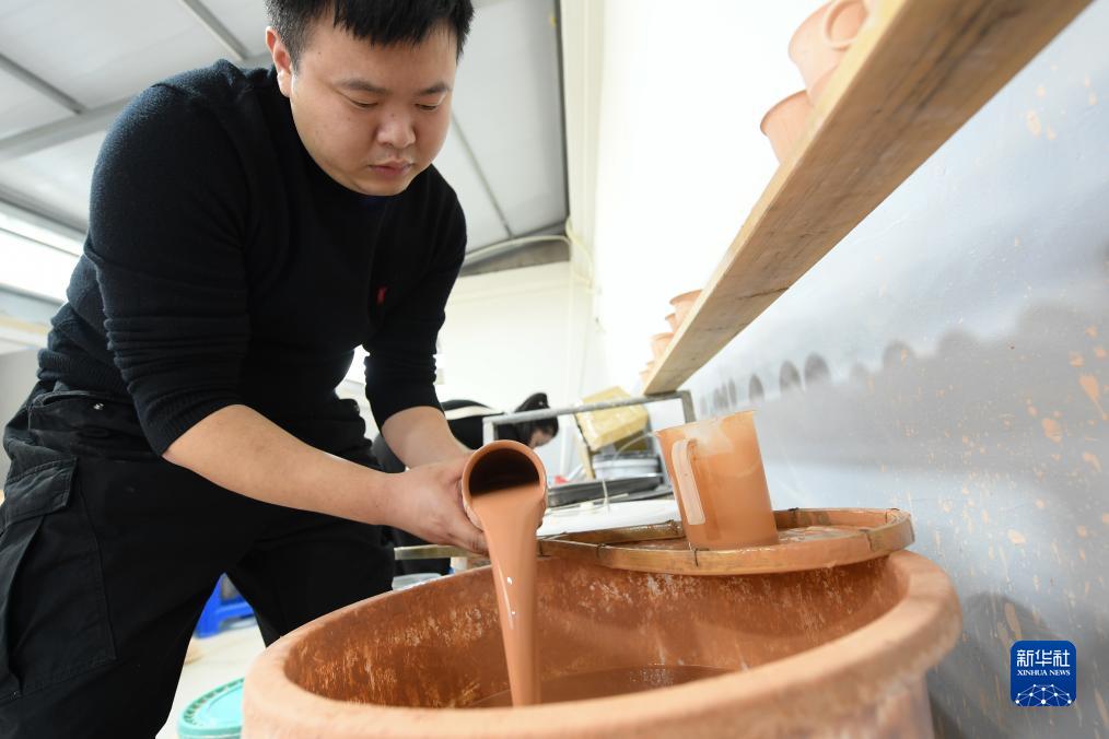 10月31日,在“梅夫人”工作室,季雙俊給瓷坯上釉。