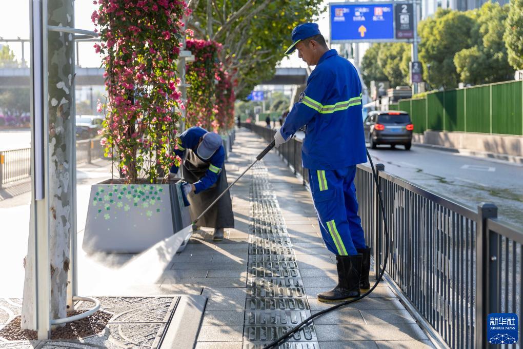 10月31日,環衛工人在場館周邊進行清潔工作。