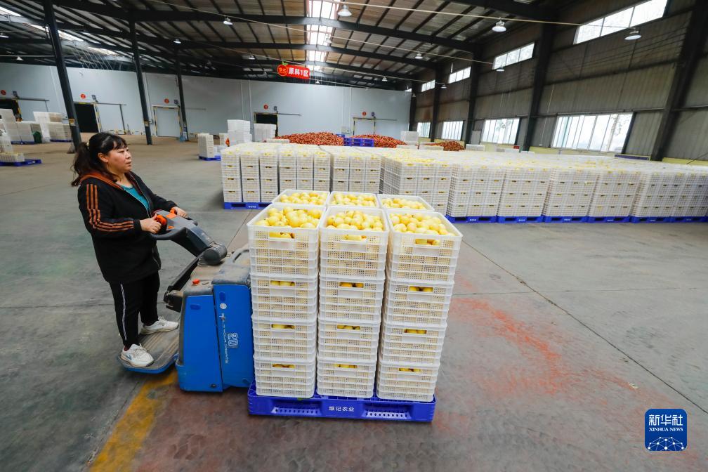 10月31日,在位於四川資陽市安岳縣的四川省維記農業集團有限公司,工人將初步挑選好的新鮮檸檬運至生産線進行清洗、分選等處理。