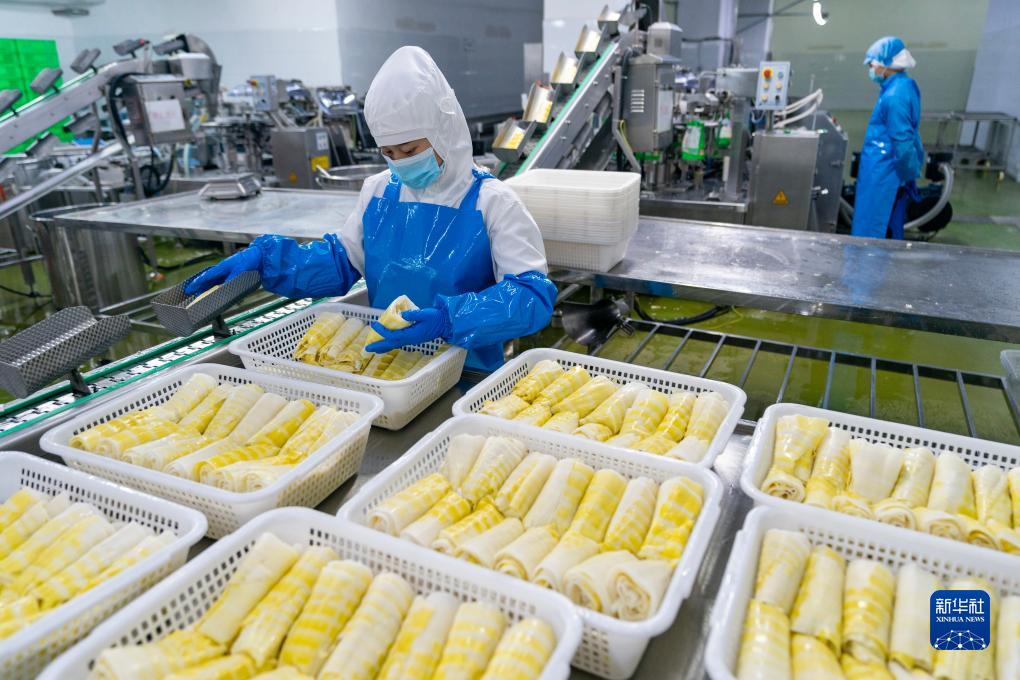 10月31日,昭通市大關縣一家竹筍生産企業員工在流水線上投放竹筍。