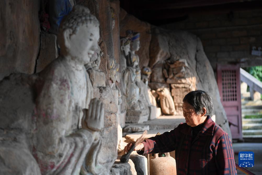 10月31日,在重慶市大足區中敖鎮金盆村,義務文保員在普聖廟摩崖造像文物保護點打掃衞生。