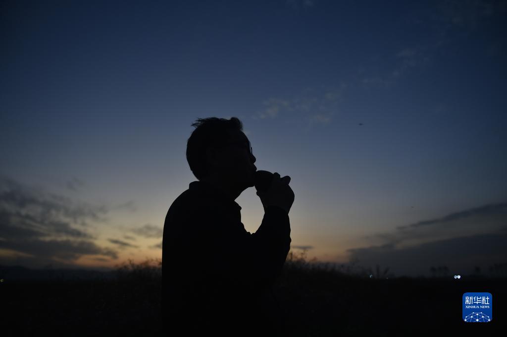 10月31日黃昏時分,王建在河南省武陟縣黃河岸邊吹奏黃河泥塤。