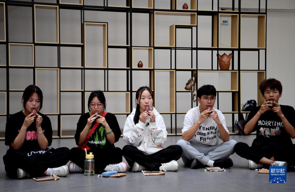 10月31日,在河南省武陟縣黃河交通學院黃河文化館內,學生在練習吹奏黃河泥塤。