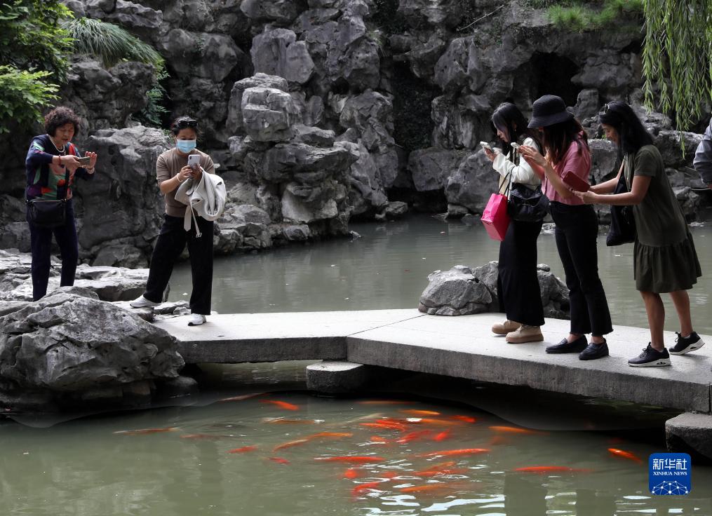 10月12日,人們在上海豫園拍攝湖中的錦鯉。