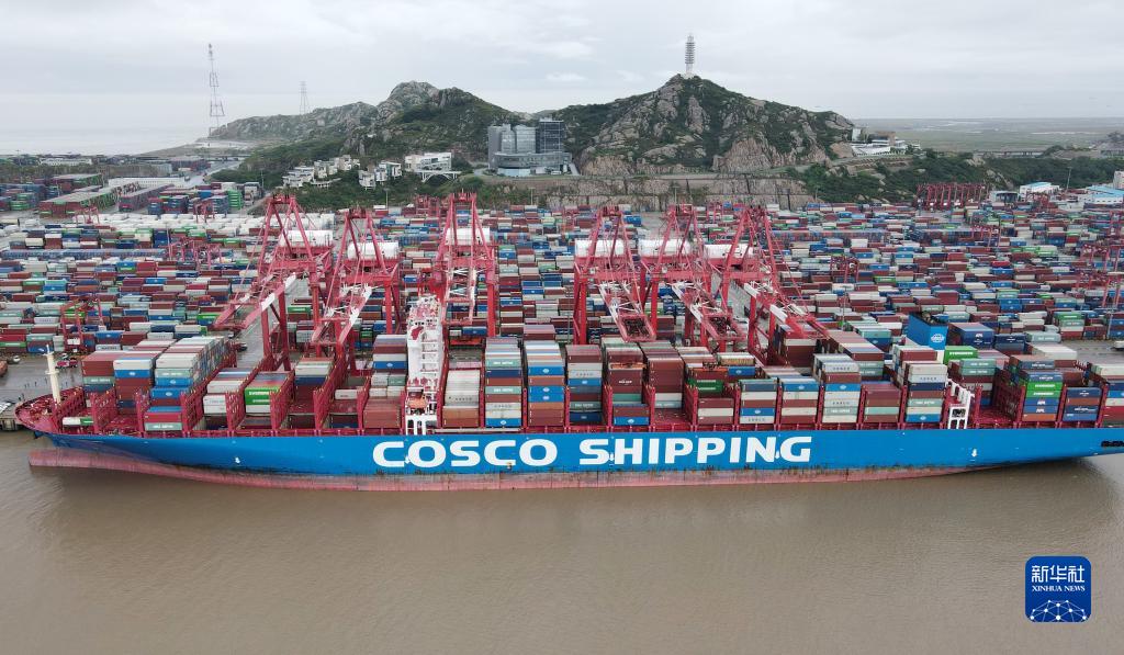 2021年10月13日,中遠海運“天秤座”輪停泊在上海洋山港二期碼頭(無人機照片)。