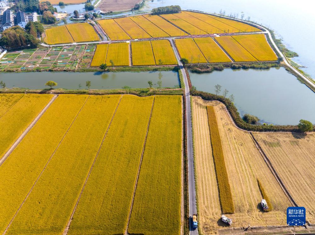 10月31日,在江蘇省昆山市錦溪鎮顧家浜村,農機在田間收穫水稻(無人機照片)。