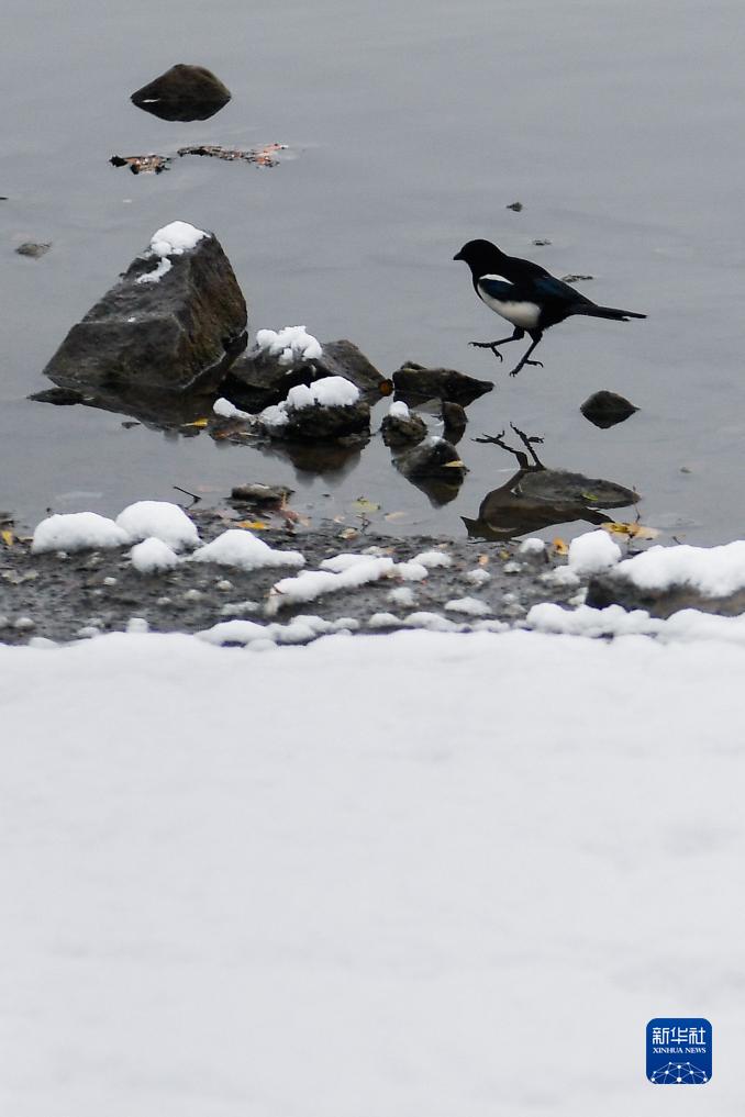 11月1日,在吉林長春,一隻小鳥在湖面積雪的石頭間跳躍。