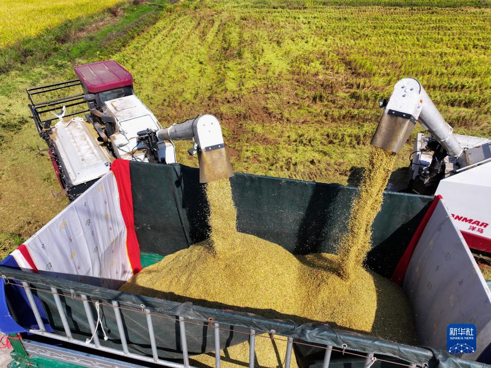 11月1日,在湖南省瀏陽市龍伏鎮焦橋村的一處高標準農田,農戶將收穫的稻穀裝車(無人機照片)。
