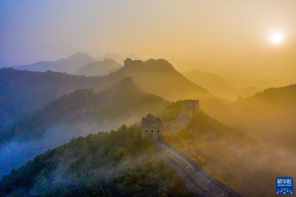 這是11月1日拍攝的河北承德金山嶺長城日出景觀(無人機照片)。