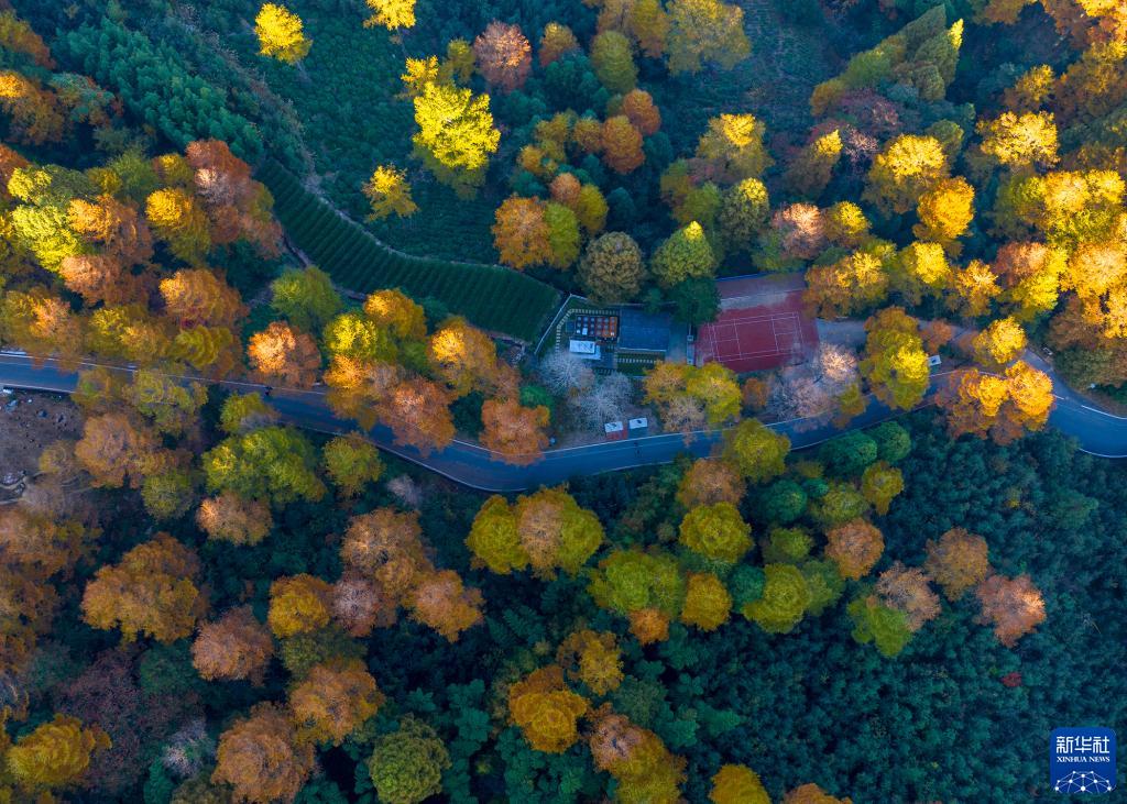 11月1日在浙江省湖州市安吉縣山川鄉九畝村金錢松公園拍攝的秋景(無人機照片)。
