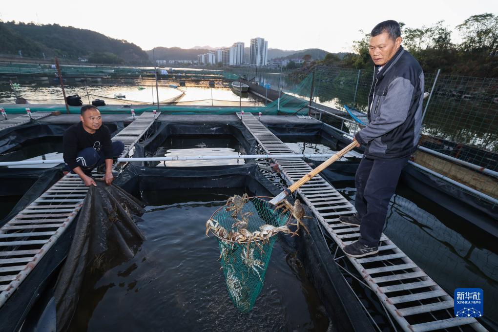 11月1日,建德市大洋鎮的大洋螃蟹養殖戶在養殖水域捕撈螃蟹。