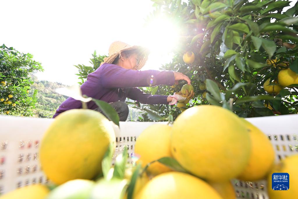11月1日,在江西省贛州市章貢區水西鎮永安村,果農在果園內採摘臍橙。