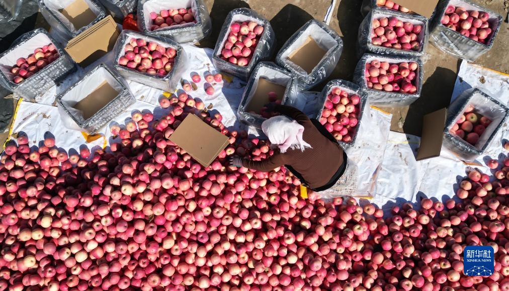 10月31日,果農在甘肅省永靖縣峴垣鎮劉家村蘋果基地分揀包裝蘋果(無人機照片)。