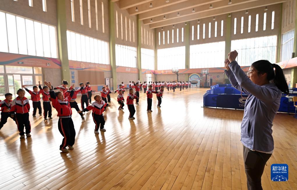 11月1日,在天津市西青區梅江富力小學,體育老師帶着學生在室內進行體育鍛煉。
