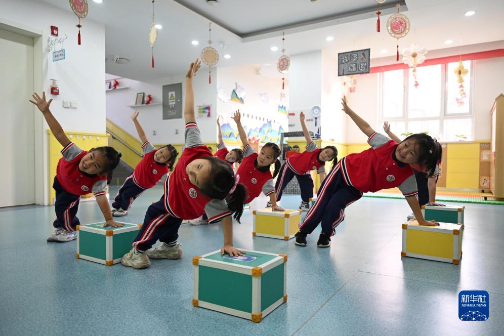 11月1日,天津市和平區第五幼兒園的小朋友在室內進行體育鍛煉。
