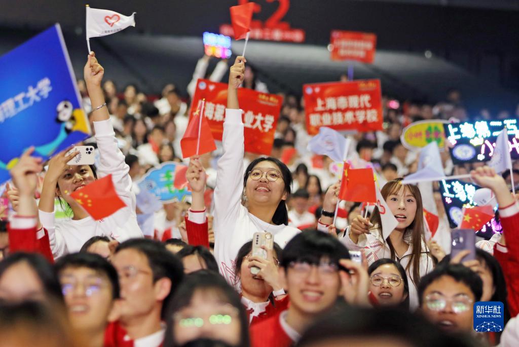 志願者們在第六屆中國國際進口博覽會志願者上崗宣誓儀式上(10月17日攝)。第六屆進博會已從上海40余所高校招募會期志願者5700余名,他們將在引導諮詢、註冊管理、聯絡接待、輔助保障、醫療衞生等崗位上開展服務。