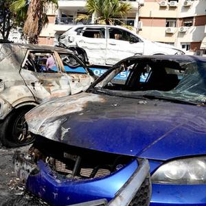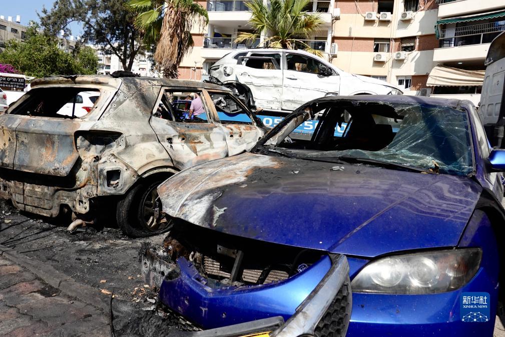 這是11月1日在以色列南部城市阿什杜德拍攝的遭火箭彈襲擊後損毀的車輛。