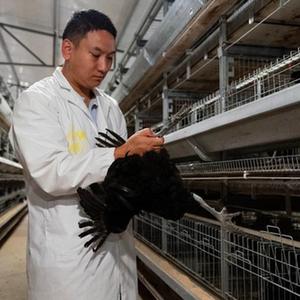 11月1日,一名工作人員在鹽津縣一家種雞場檢查烏骨雞生長情況。