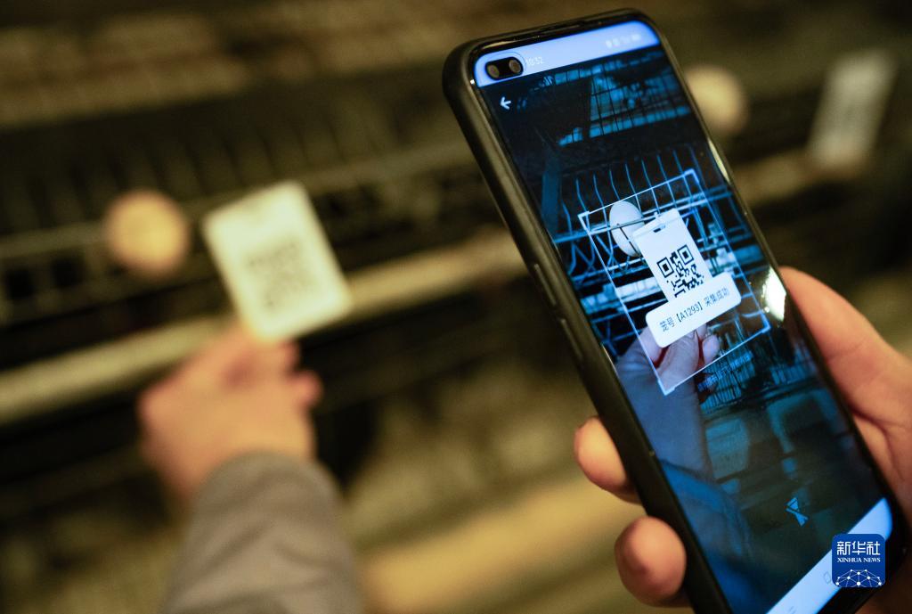 11月1日,一名工作人員在鹽津縣一家種雞場掃碼記錄種雞下蛋情況。