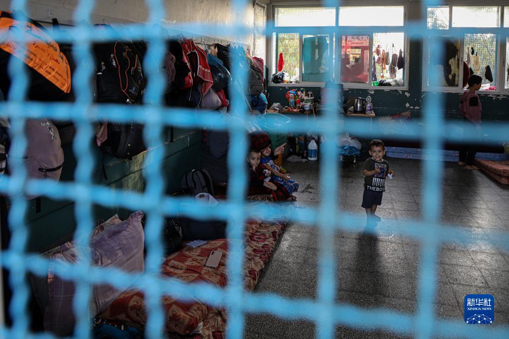 這是11月1日在加沙地帶南部城市汗尤尼斯一處臨時難民營地拍攝的流離失所的兒童。