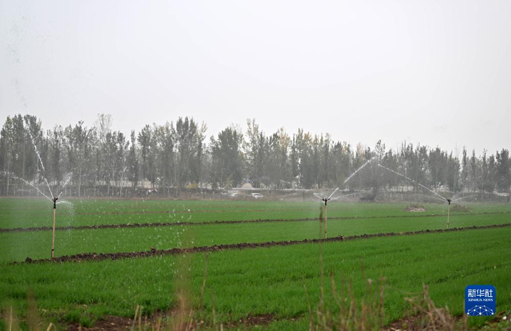 11月2日在天津市西青區辛口鎮當城村拍攝的一處正在進行噴灌的農田。