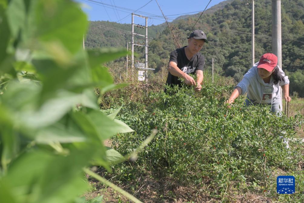 11月1日,李飛(左)和王霖娜在自家菜園採摘紅辣椒。