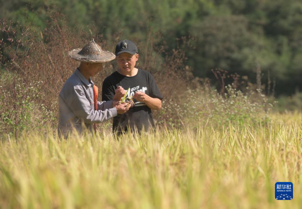 11月1日,李飛(右)和他的父親在水稻田裏查看水稻的長勢。