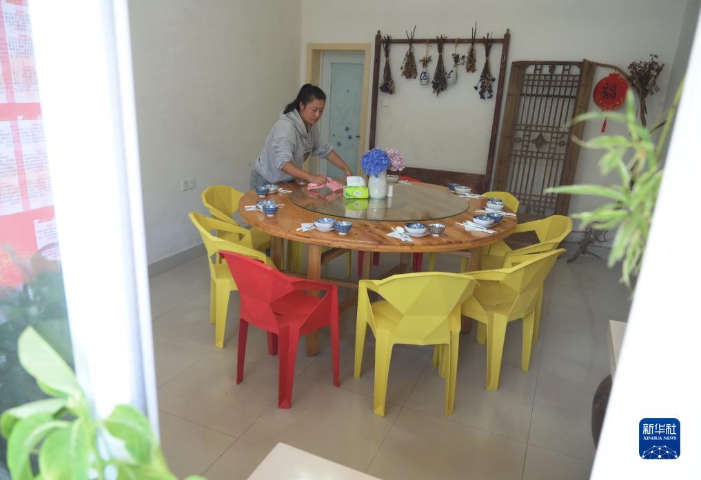 11月1日,王霖娜在她經營的“農家樂”裏整理餐桌。