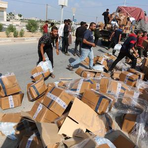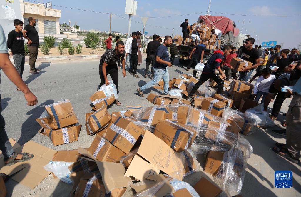 11月2日,在加沙地帶南部,人們從卡車上卸下人道救援物資。