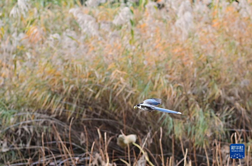 11月3日,一隻灰喜鵲在北京頤和園耕織圖景區覓食。
