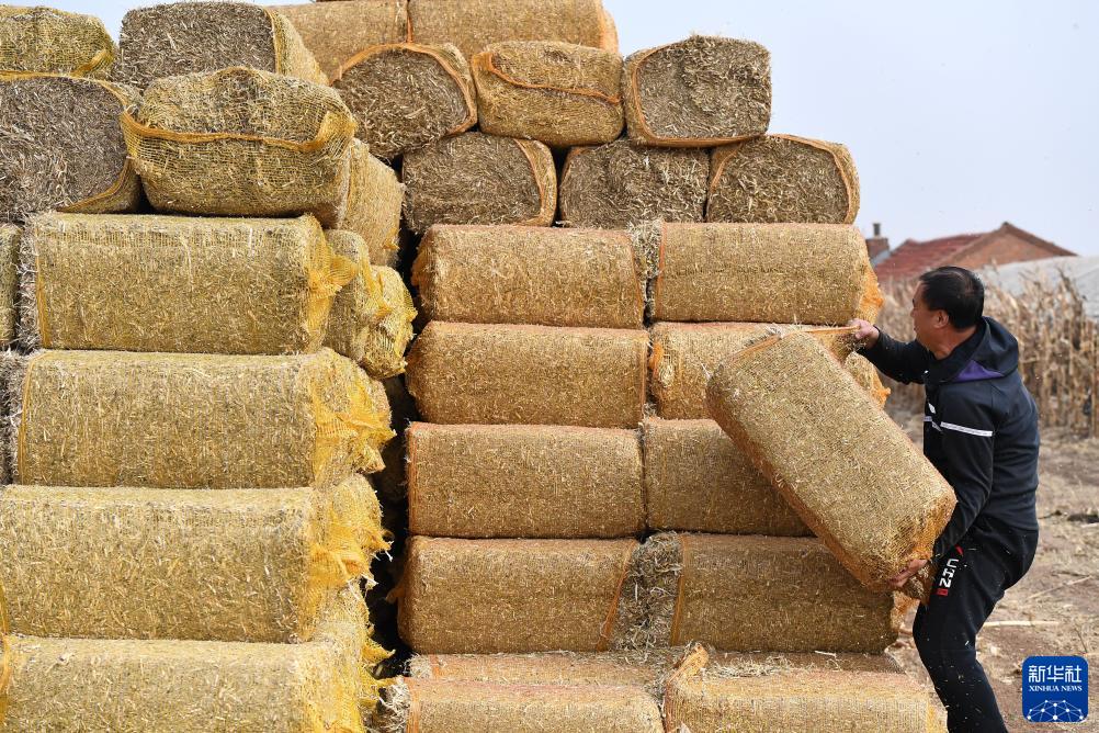 11月2日,在吉林省四平市梨樹縣喇嘛甸鎮,農民搬運打包好的秸稈。