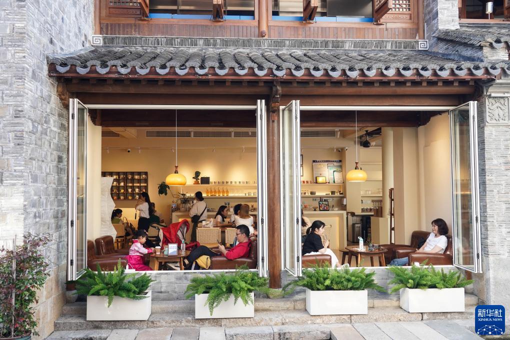 人們在棲霞古鎮一家咖啡店休閒(11月2日攝)。