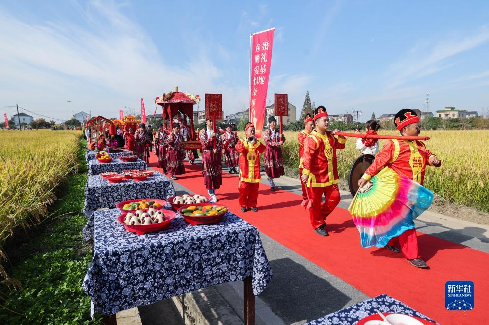 坐上大花轎、走過合歡橋、跨過紅火缸、同乘幸福船……11月3日,一場“良緣水鄉締 佳偶自天成”水鄉集體婚禮在浙江省杭州市臨平區塘棲鎮丁河村新建成的“丁山湖魚鷹愛情故事婚禮基地”舉行。八對新人在村民和游客的見證下喜結良緣,並發出《婚俗改革倡議書》,向廣大適婚青年傳播新時代的婚戀觀,倡導健康文明的嫁娶新風尚。該婚禮基地依託水鄉風貌,已成為當地特色鄉村文旅品牌。