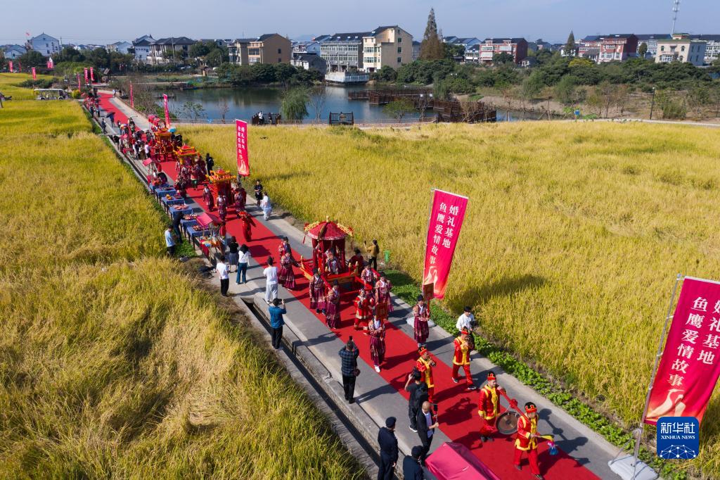 坐上大花轎、走過合歡橋、跨過紅火缸、同乘幸福船……11月3日,一場“良緣水鄉締 佳偶自天成”水鄉集體婚禮在浙江省杭州市臨平區塘棲鎮丁河村新建成的“丁山湖魚鷹愛情故事婚禮基地”舉行。八對新人在村民和游客的見證下喜結良緣,並發出《婚俗改革倡議書》,向廣大適婚青年傳播新時代的婚戀觀,倡導健康文明的嫁娶新風尚。該婚禮基地依託水鄉風貌,已成為當地特色鄉村文旅品牌。