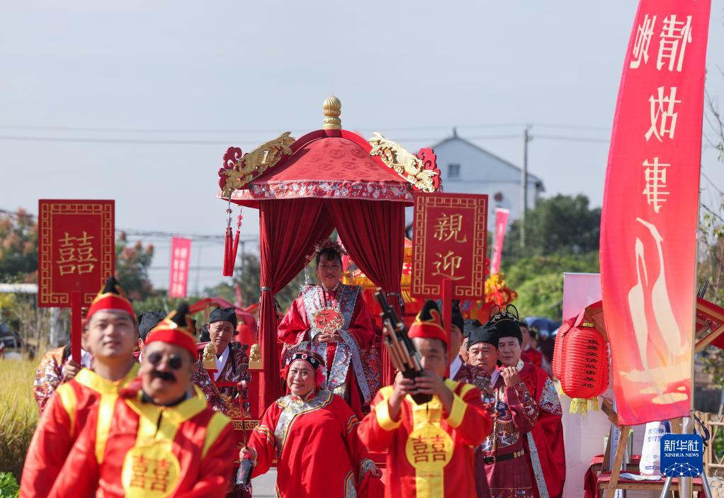 坐上大花轎、走過合歡橋、跨過紅火缸、同乘幸福船……11月3日,一場“良緣水鄉締 佳偶自天成”水鄉集體婚禮在浙江省杭州市臨平區塘棲鎮丁河村新建成的“丁山湖魚鷹愛情故事婚禮基地”舉行。八對新人在村民和游客的見證下喜結良緣,並發出《婚俗改革倡議書》,向廣大適婚青年傳播新時代的婚戀觀,倡導健康文明的嫁娶新風尚。該婚禮基地依託水鄉風貌,已成為當地特色鄉村文旅品牌。