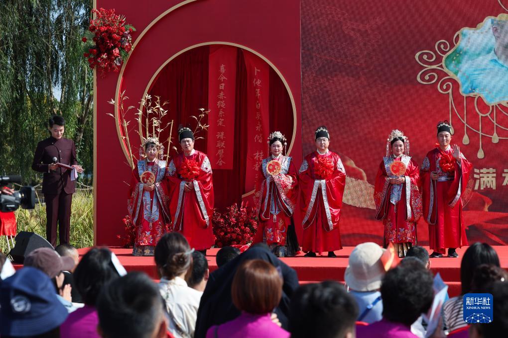 坐上大花轎、走過合歡橋、跨過紅火缸、同乘幸福船……11月3日,一場“良緣水鄉締 佳偶自天成”水鄉集體婚禮在浙江省杭州市臨平區塘棲鎮丁河村新建成的“丁山湖魚鷹愛情故事婚禮基地”舉行。八對新人在村民和游客的見證下喜結良緣,並發出《婚俗改革倡議書》,向廣大適婚青年傳播新時代的婚戀觀,倡導健康文明的嫁娶新風尚。該婚禮基地依託水鄉風貌,已成為當地特色鄉村文旅品牌。