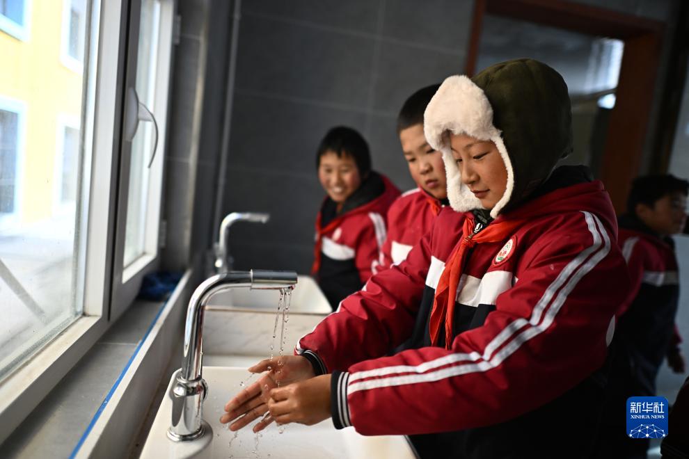 在青海省果洛藏族自治州瑪多縣花石峽鎮藏文中心寄宿制學校,五年級學生東桑(右一)在使用廁所後洗手,該學校是環境衞生特別項目學校之一(11月2日攝)。