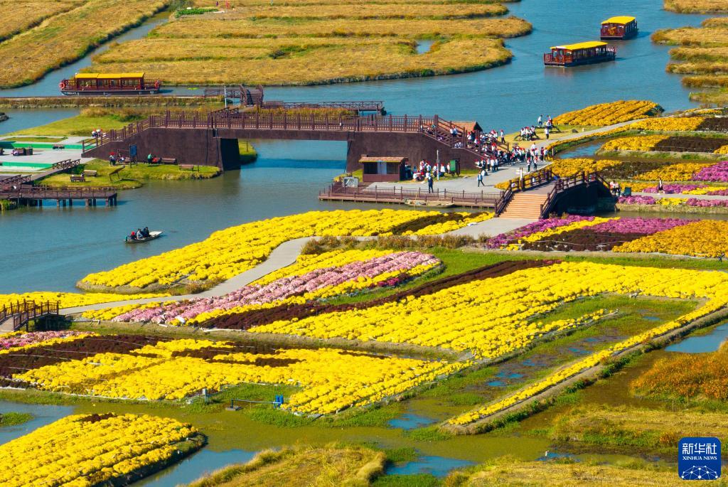 11月1日,游客在江蘇省興化市千垛景區賞菊游玩(無人機照片)。