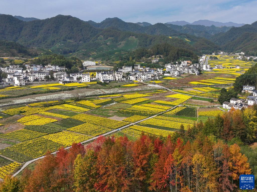 11月3日在安徽省黃山市歙縣溪頭鎮桃源村拍攝的菊花田(無人機照片)。