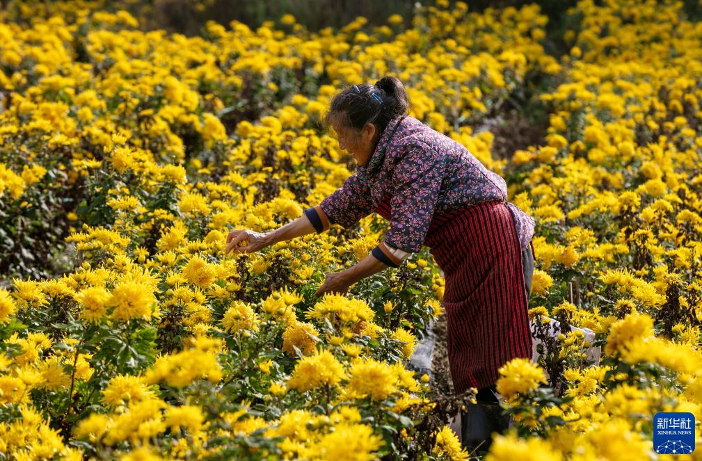 10月29日,村民在重慶市南川區黎香湖鎮東湖村中藥材基地裏採摘金絲皇菊。