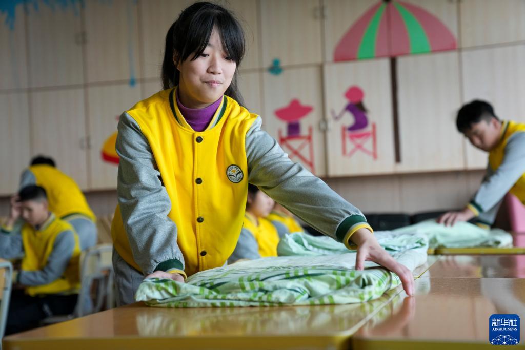 10月30日,在重慶市特殊教育中心的教室內,幾名六年級的視力障礙學生進行疊被子生活技能小比賽。